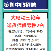 招聘 邱县大型建材营销策划中心 招聘:骑大电动三轮车工人,有三轮证,不吸烟无纹身优先,男性两名,1.7米以上,20到40岁。 县城居住